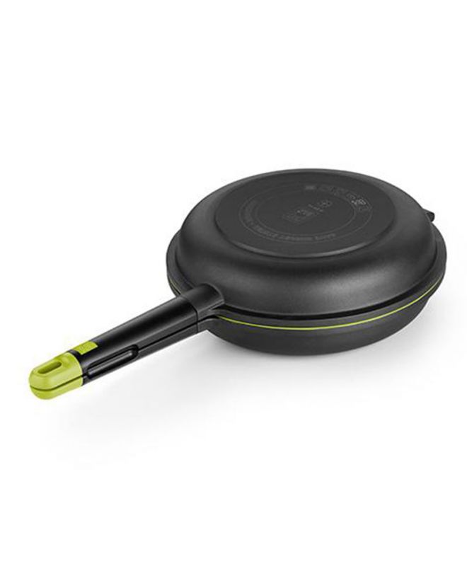 Les deux parties peuvent également être utilisées indépendamment et une fois réunis les deux aimants placés sur les anses assurent une excellente fermeture de la poêle double.